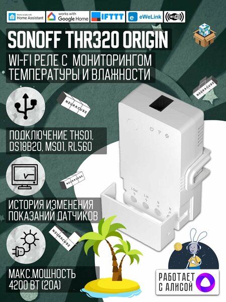 Sonoff THR320 — умное Wi-Fi реле с мониторингом температуры и влажности Контролируйте электрические приборы и следите за климатом в помещении с помощью Sonoff THR320 — надёжного реле для умного дома. ✨ Основные преимущества: