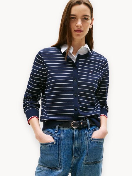 Женский кардиган WW0WW423700ZB темно-синий в полоску — это стильный и универсальный элемент гардероба, сочетающий в себе классический дизайн и современные модные тенденции. Модель выполнена с использованием контрастных полосок, которые придают образу динамики и делают вещь заметной и интересной.