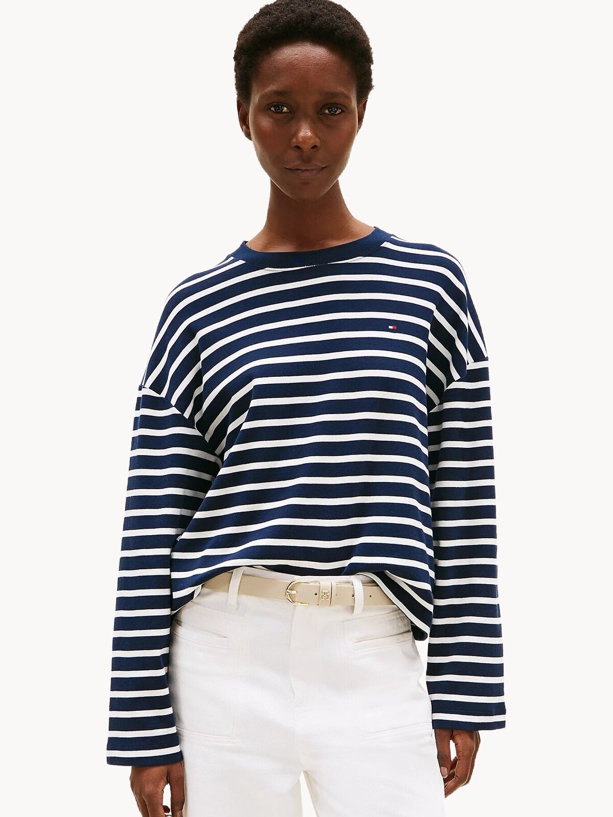 Этот лонгслив из чистого хлопка оформлен в классическую бретонскую полоску, придавая образу легкую морскую нотку. Прямой крой, длинные рукава и приспущенные плечи обеспечивают расслабленную посадку и комфорт на каждый день. Круглый вырез и фирменные акценты — логотип Tommy Jeans, а также вышивка в виде флага Tommy на груди — подчеркивают узнаваемый стиль бренда. Идеальный вариант для создания непринужденных повседневных луков. Изготовлено из качественного материала, который обеспечивает комфорт и долговечность.