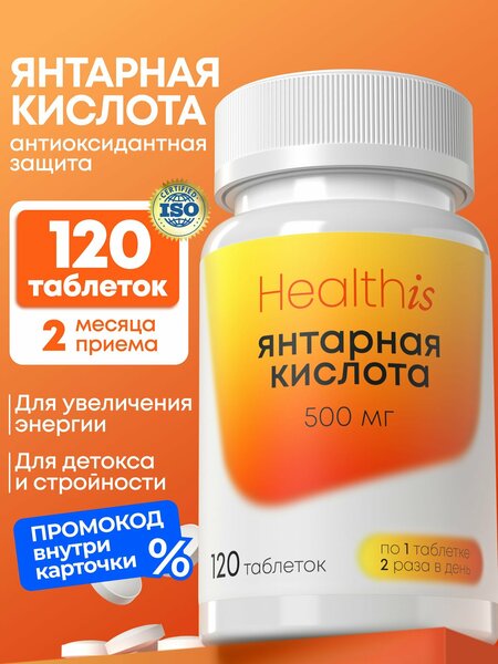 Янтарная кислота от бренда Healthis – незаменимая поддержка организма. Прием янтарной кислоты помогает повысить уровень энергии и выносливость организма. Более того, она поддерживает работу мозга и сердечно-сосудистой системы. Регулярный прием янтарной кислоты способствует замедлению процессов старения и улучшает метаболические процессы в организме. Янтарная кислота помогает облегчить похмелье, ускоряя выведение токсинов и восстанавливая энергетический обмен в клетках. Она снижает интоксикацию, поддерживает работу печени и уменьшает головную боль и слабость.