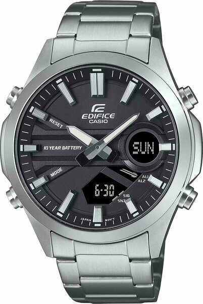 Японские мужские часы. Коллекция Edifice. Самый практичный аксессуар, который никогда не подведет вас в вопросах времени. Тип механизма: кварцевый. Корпус: сталь. Циферблат: черный. Браслет: стальной. Водозащита: 100WR. Звуковой сигнал: 3 будильника, один с функцией Snooze, ежечасный сигнал. Стекло: минеральное. Календарь: автоматический: число, день недели, месяц (до 2099г). Габаритные размеры: 45,5х49,5мм, толщина 13,7мм, вес 141г.