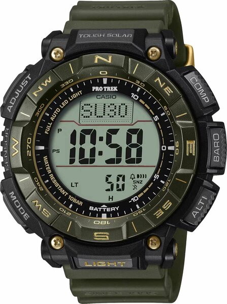 Японские мужские часы. Коллекция Pro Trek. Pro Trek. Мужские часы. Модель создана в честь 30-летия коллекции Pro Trek. Цветовая гамма поддерживает концепцию коллекции «единство с природой». Корпус и ремешок выполнены из биопластика, который изготавливается из возобновляемых органических ресурсов. Питание от солнечной энергии Tough Solar - солнечные батарейки большой мощности, индикатор заряда батареи. Функция автоматического сохранения энергии. Время работы аккумулятора без подзарядки приблизительно 7 месяцев, при включенной функции сохранения энергии приблизительно 27 месяцев. Подробнее >>• Модуль часов рассчитан на работу при низких температурах до -10°С/14°F. • Циферблат подсвечивается светодиодом. Настраиваемое послесвечение 1,5 или 3сек. Цвет подсветки: белый. • 12-ти и 24-х часовой формат времени. • Секундомер с точностью показаний 1/10с и временем измерения 1000ч. SPLIT-хронограф. • Таймер обратного отсчета от 1мин до 24ч. • Мировое время – 48 городов (31 часовой пояс), всемирное координированное время (UTC). Функция включения/отключения летнего времени. • Время восхода и захода Солнца на определенную дату. • Технология Triple Sensor позволяет точно и легко определять сторону света, температуру и атмосферное давление. • Термометр от -10° до +60°С (от 14 до 140 °F) с точностью 0,1°C. • Барометр - измерение атмосферного давления от 260 до 1100 гПа (от 195 до 825 мм рт. ст.). График тенденции и перепада атмосферного давления. • Встроенный цифровой компас измеряет и отображает направление в виде одной из 16 точек. Диапазон измерения от 0° до 359° с точностью 1°. Графический указатель направления. Двунаправленная калибровка. Коррекция магнитного склонения. • Двухслойный ЖК-дисплей позволяет одновременно отображать компас на верхнем слое, время или различные измерения на нижнем слое. • Высотомер - встроенный датчик барометрического давления с возможностью вывода результатов в единицах высоты над уровнем моря (от -700 до 10000 метров), единица измерения 1м. График набора высоты. Хранение до 30 записей о высотных точках рельефа местности - измеренной абсолютной высоты, даты и времени. • Удобное расположение кнопок позволяет управлять устройством в одно касание.• Функция отключения/включения звука кнопок.• Вращающийся безель.• Задняя крышка крепится на 4-х винтах.• На ремешок нанесены названия предыдущих культовых моделей Pro Trek.• Классическая застежка и система быстрой замены. Тип механизма: кварцевый. Корпус: пластик. Циферблат: ЖК серый. Браслет: пластиковый. Водозащита: 100WR. Подсветка: светодиодная. Звуковой сигнал: 5 будильников, один с функцией Snooze, ежечасный сигнал. Стекло: минеральное. Календарь: автоматический: число, день недели, месяц (до 2099г). Габаритные размеры: 51,7x54,7мм, толщина 15,1мм, вес 62г.