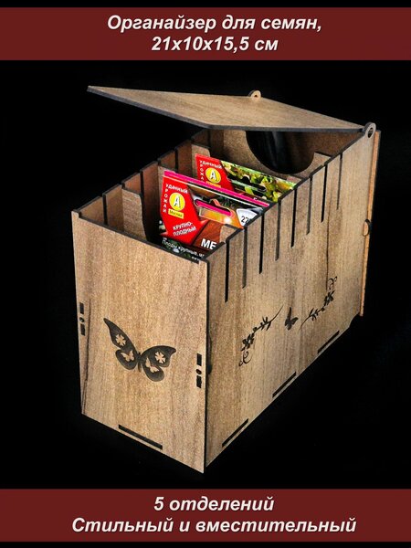 Ящиков для хранения семян - не бывает много. Очень легко ликвидировать беспорядок на полке, всего лишь поставив на полку коробку - у вас сразу появится удобный органайзер для семян с разделителями. Обычно мы храним семена в простых коробках и поиск чего-то нужного занимает значительное время. Коробка для семян с разделителями позволит значительно упростить процесс поиска. Все разделители вынимаются, можно легко изменить ширину отделения под ваши запросы. Органайзер может использоваться для хранения любых мелочей, количество отделений можно регулировать на ваше усмотрение. Резная шкатулка с крышкой - прекрасный подарок на новый год, 8 марта или на день рождения. После распаковки может чувствоваться запах дерева, через несколько дней запах полностью пропадет.