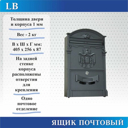 Ящик почтовый уличный LB предназначен для принятия почтовой корреспонденции. На задней стенке корпуса расположены отверстия для крепления. В дверь установлен 1 замок типа «Cam-Lock». Покрытие электрополимерное. В наличии ящики четырех античных цветов: медный, бронзовый, зеленый, черный.