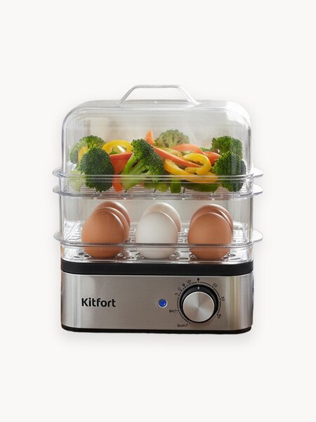 Идеальные завтрак за 10 минут! Яйцеварка «2 в 1» КТ-6958 совмещает в себе яйцеварку и пароварку, потому что предназначена для варки яиц и других продуктов на пару. Данное устройство решит проблему того, что же придумать на завтрак, обед или ужин. Выберите свой уровень приготовления Благодаря двум уровням в яйцеварке вы можете варить до 8 яиц на 1 уровне и другие продукты на 2 уровне одновременно. Основание с углублениями делает приготовление яиц более удобным. Время приготовления можно регулировать вручную. Регулируйте степень приготовления количеством воды В корпусе яйцеварки находится резервуар для воды с нагревательным элементом. Также на стенке резервуара находится мерная шкала, обозначающая минимальное и максимальное количество заливаемой внутрь воды. Ровно столько, сколько нужно! Мерный стакан поможет налить вам точное количество воды в резервуар из расчёта на количество яиц и от степени приготовления. В дно стакана встроена игла, с помощью которой вы можете проколоть скорлупу. Эргономичный корпус Корпус яйцеварки выполнен из пластика и нержавеющей стали, а прозрачная крышка и паровой отсек позволяют наблюдать за процессом приготовления. Яйцеварка компактна, она не занимает много места.