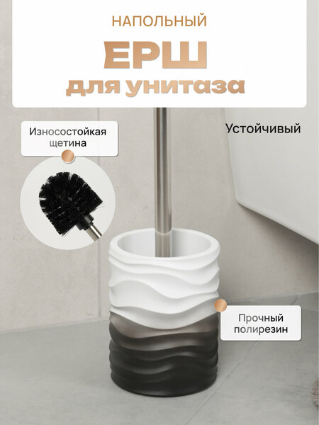 Ерш MIST - функциональное и стильное решение для современной ванной комнаты. Его минималистичный дизайн с волнообразной формой и плавным переходом от белого к серому цвету прекрасно сочетается с различными стилями интерьера. Прочный полирезин обеспечивает долговечность и устойчивость к влаге, что делает этот ершик для унитаза идеальным выбором для ежедневного использования. Выберите ерш MIST и оцените:
