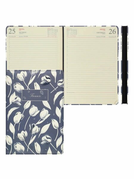 Ежедневник датированный на 2026 год сочетает строгую элегантность и продуманную функциональность: плотная обложка защищает страницы, а удобный формат помещается в сумку или рабочий портфель; каждая дата сопровождается строками для планов, приоритетов и заметок, что упрощает распределение дел, учёт важных встреч и отслеживание прогресса в проектах. Внутренний блок напечатан на качественной бумаге, предотвращающей просвечивание чернил, предусмотрены разделы для кратких контактов, списков покупок и идей, карты месяца помогают быстро оценивать загруженность, дополнительные страницы для выражения мыслей и рефлексии способствуют личному развитию, а ленточная закладка обеспечивает моментальный доступ к текущему дню. Дизайн выполнен в сдержанных тонах, подходит как для деловых переговоров, так и для творческих встреч; аккуратная верстка, укреплённый корешок и цифровая таблица праздничных дат повышают удобство использования, а экологичные материалы производства отражают ответственность бренда. Такой ежедневник станет стильным атрибутом рабочего стола, помогающим планировать, фиксировать идеи и достигать поставленных целей в течение всего года. Ежедневник, датированный 2026 год, А5, твердый картон 7Бц, кожзам, поролон, 176 листов, цвет синий, Тюльпаны, Brigfut, 253039. формат: А5; цвет: синий; количество листов: 176 листов; обложка: твердый картон 7Бц, кожзам, поролон; внутренний блок: офсет тонированный; скрепление: книжный переплет; количество карманов: 1 внутренний; печать блока: 2 краски; закладка: 2 ляссе; пол: женский; линовка: линия; справочный материал: да; перфорация уголков блока: да; срез: черный; отстрочка: да; лакирование: выборочное; датировка: датированный 2026 год; Торговая марка: Brigfut; Страна: Китай.