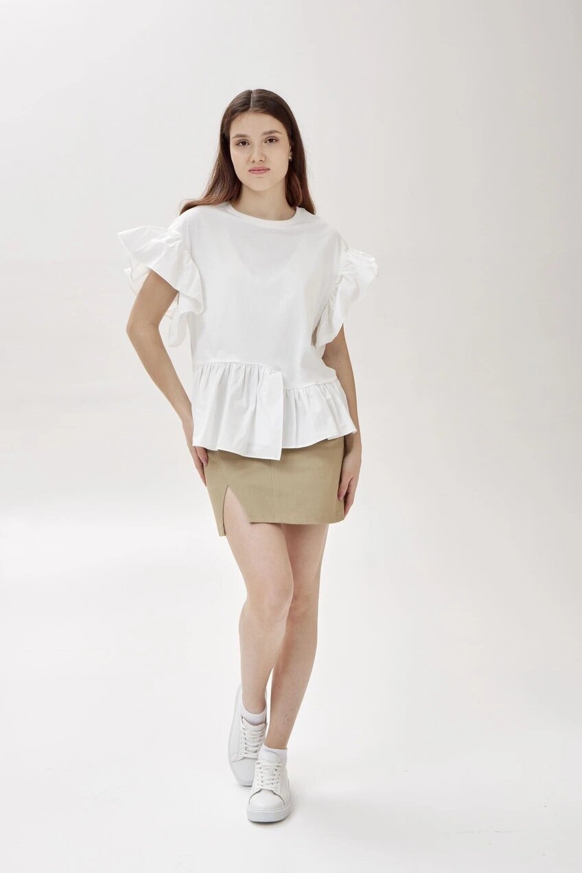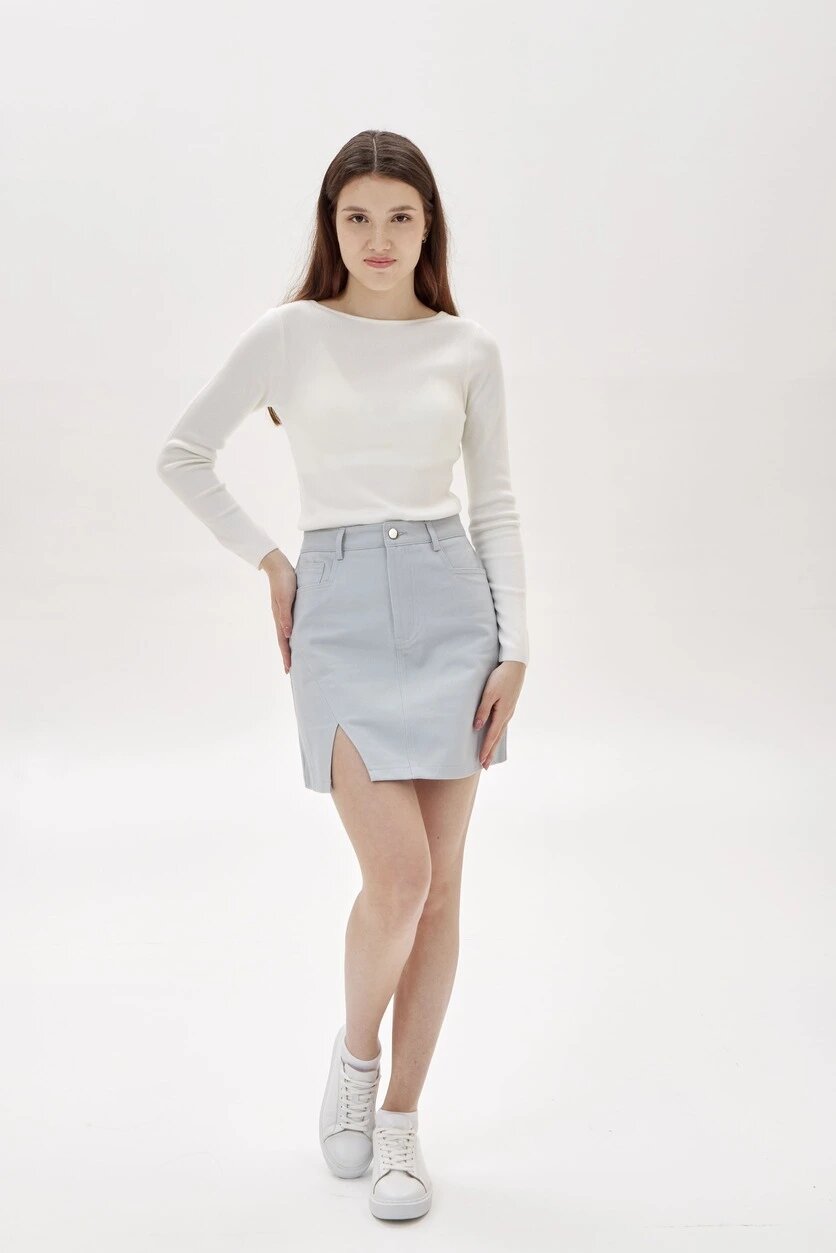 Юбка длины мини прямого кроя на завышенной линией талии с разрезом на ноге и застежкой на молнию спереди. Модель выполнена из плотного и износостойкого твила.