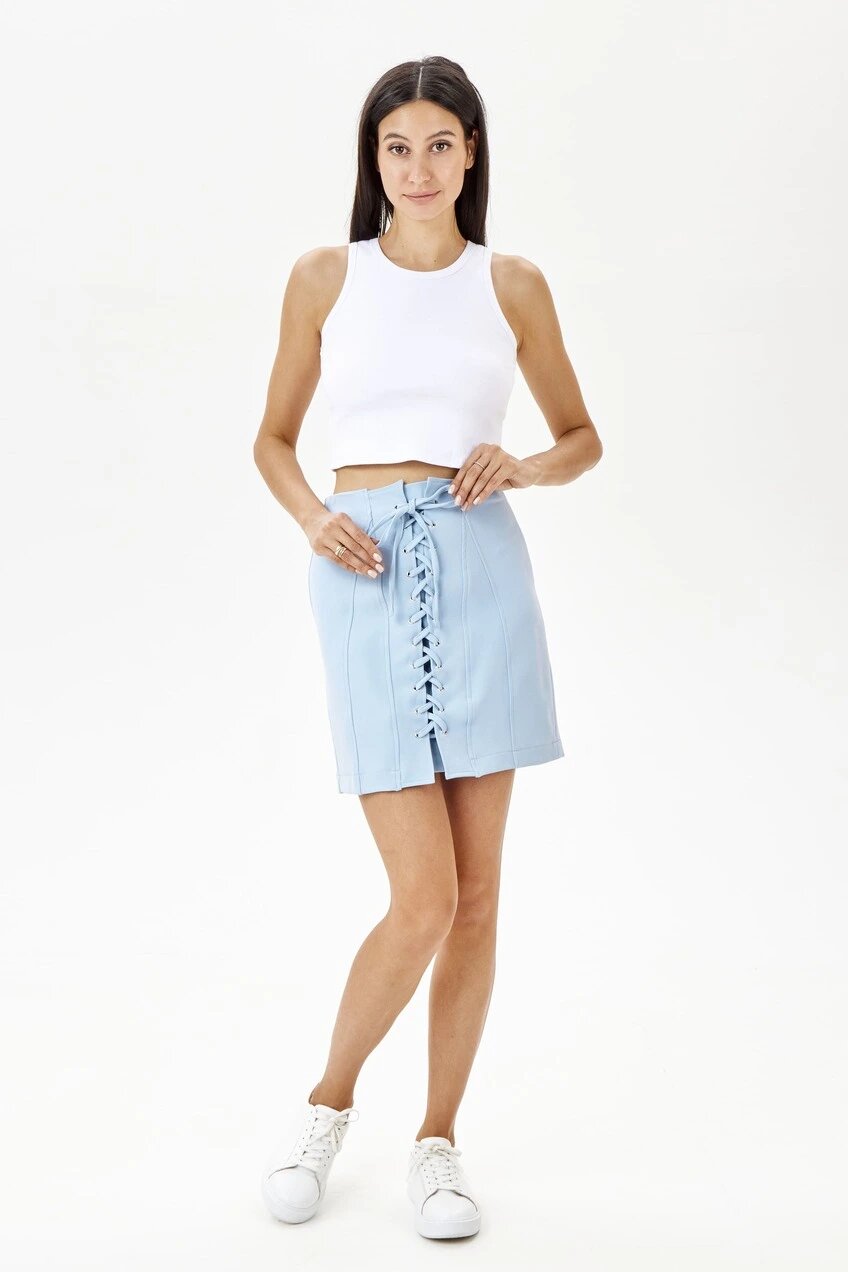 Эффектная прилегающая юбка длины мини на высокой посадке, дополненная шнуровкой в тон. Станет оригинальным дополнением вашего гардероба.