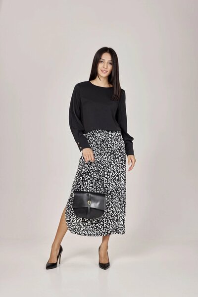 Элегантная слегка расклешенная юбка длины миди с дерзким анималистическим принтом. Высокий разрез приоткрывают ногу и добавляют еще больше ощущения свободы. А завышенная линия талии и потайная застежка на молнию сбоку отвечают за комфорт.