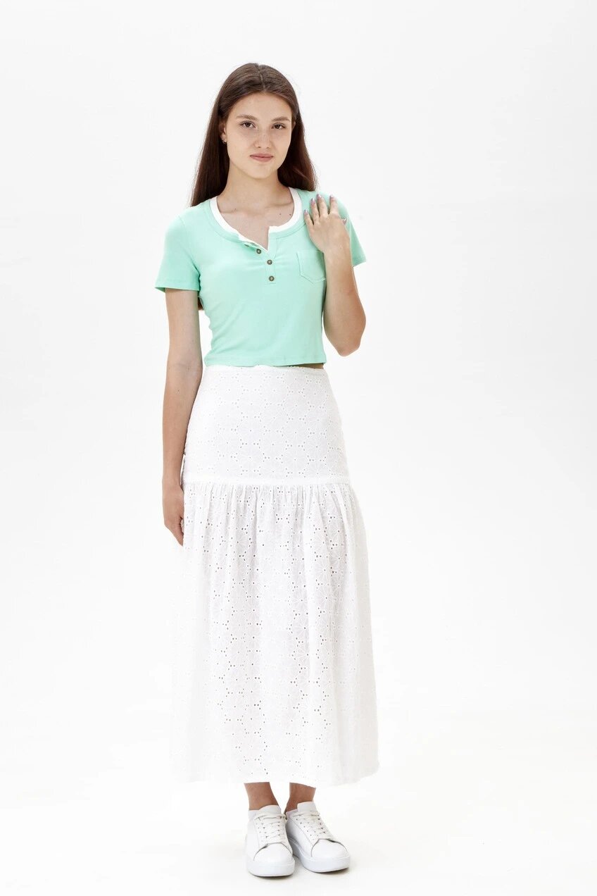 Юбка миди на высокой посадке с цветочным перфорированным узором. Модель с широкой оборкой и застежкой на потайную молнию сбоку. Для создания комплекта сочетайте с соответствующим топом в тон.