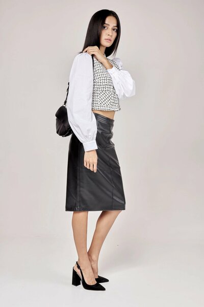 Прилегающая юбка длины миди с эффектным разрезом сзади и перекрестными рельефными швами. Модель выполнена из гладкой матовой экокожи. Создает стильные комплекты с топами, блузками и рубашками.