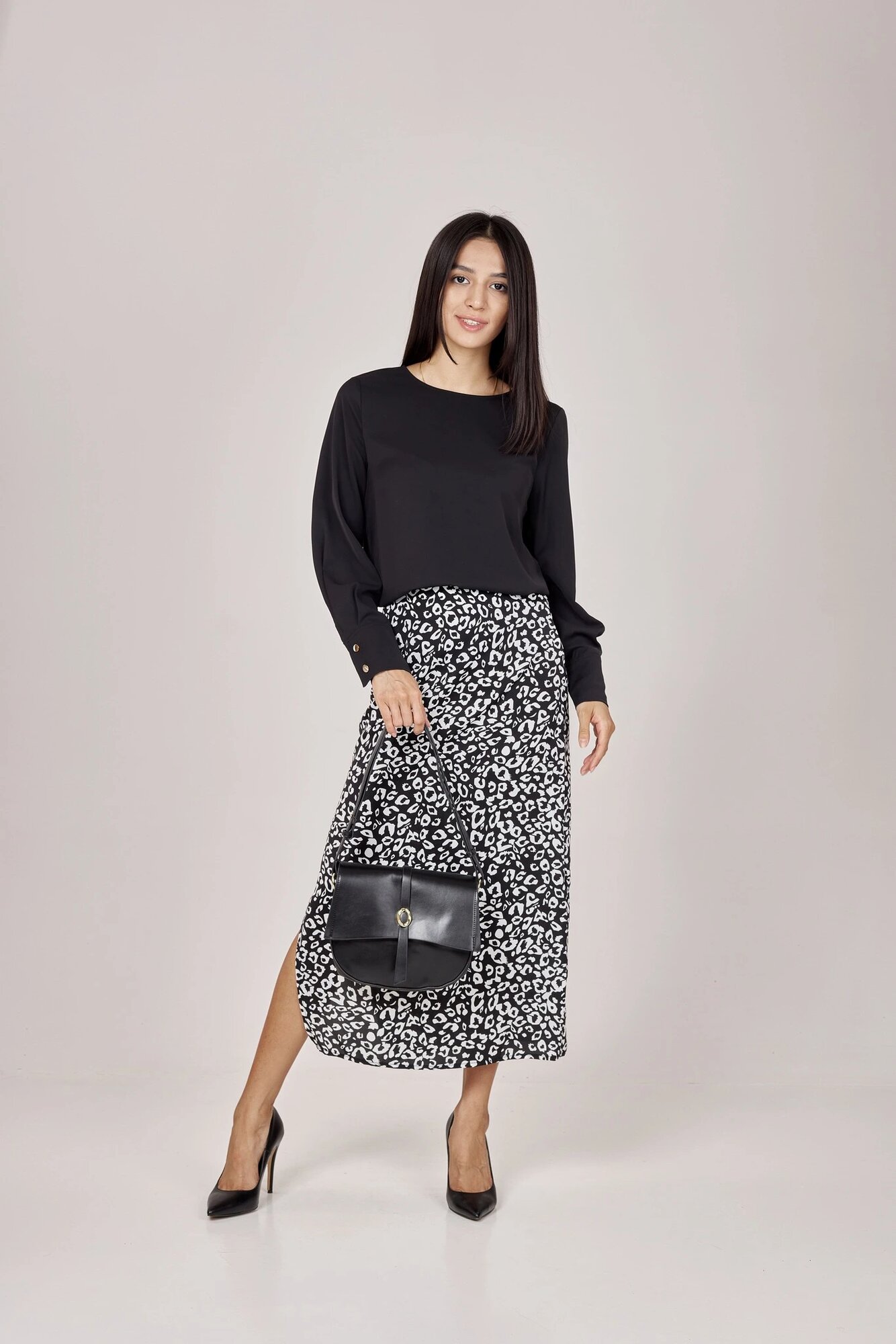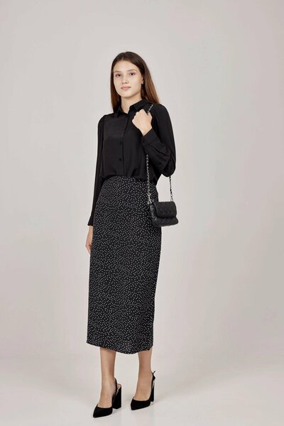 Элегантная слегка расклешенная юбка длины миди с благородным принтом в горошек. Высокий разрез приоткрывают ногу и добавляют еще больше ощущения свободы. А завышенная линия талии и потайная застежка на молнию сбоку отвечают за комфорт.