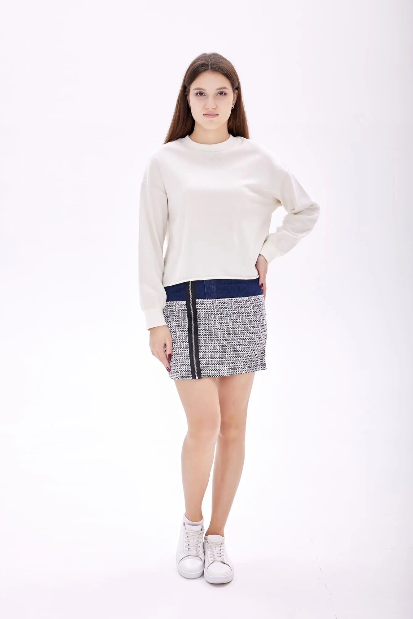 Безумная комбинированная юбка длины мини. Верхняя часть выполнена из денима, нижняя – из твида. Модель имеет классическую фурнитуру в виде шлевок для ремня, гульфик с металлической пуговицей и карманы. Сочетайте юбку с таким же ярким верхом и будьте самой неповторимой модницей.