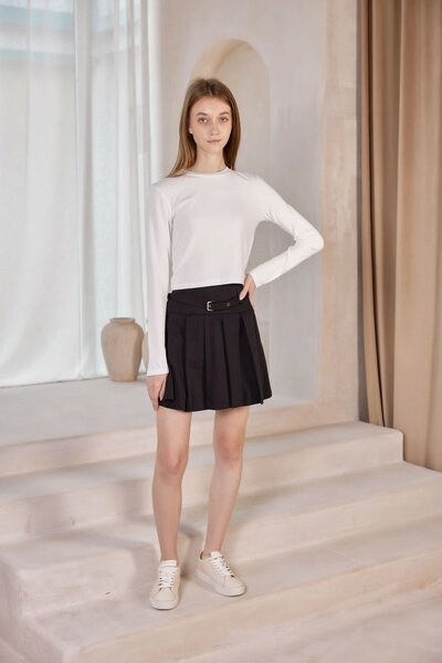 Юбка длины мини в крупную складку, дополненная широким отрезным поясом со шлевками под ремешок в тон. Имеет застежку на потайную молнию сбоку. Отлично сочетается с топами, футболками и рубашками.