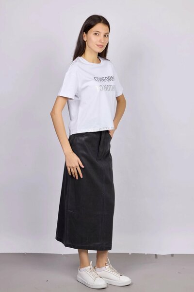 Прямая юбка длины макси на средней посадке, дополненная шлевками под пояс и высоким разрезом спереди. Имеет застежку на молнию с пуговицей. Будет отлично смотреться с топами, блузками, рубашками и футболками.