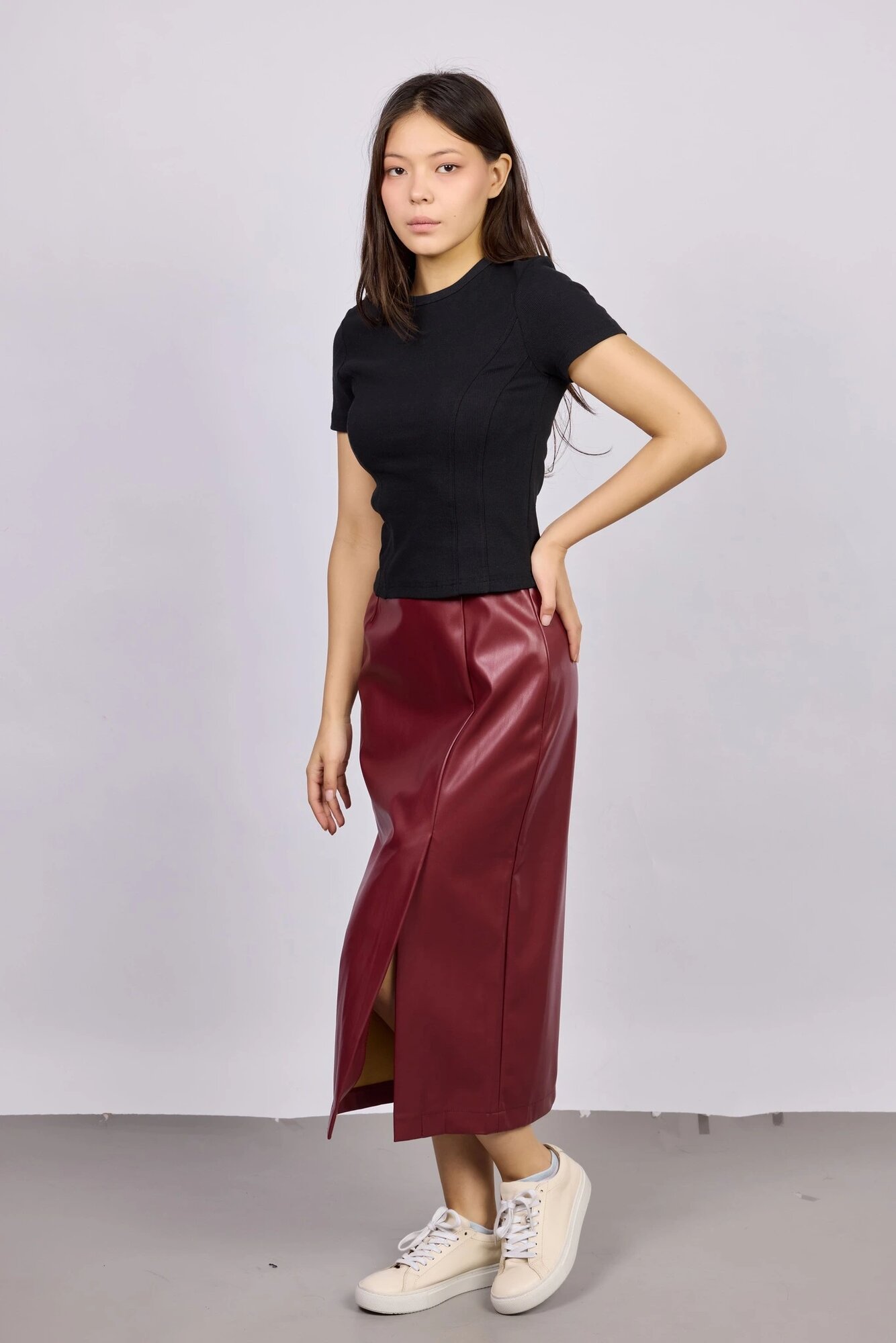Прямая юбка длины миди с эффектным разрезом спереди и рельефными швами. Модель выполнена из гладкой матовой экокожи. Создает стильные комплекты с топами, блузками и рубашками.