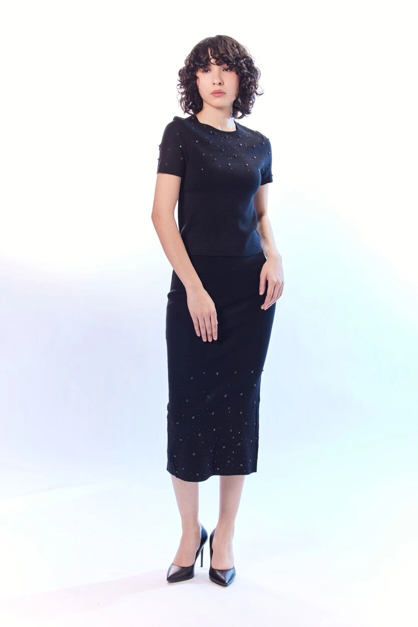 Элегантная прямая трикотажная юбка с отделкой из страз и высоким разрезом сзади. Лаконичный крой и мягкий материал обеспечивают комфорт и стиль, подчёркивая фигуру. Универсальная модель идеально подойдёт для офиса, прогулок или вечерних встреч.