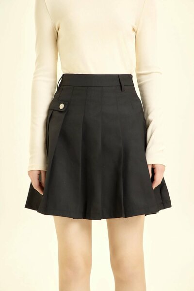 Юбка с расклешённым силуэтом и декоративной планкой — стильная модель, вдохновлённая элементами классической формы. Аккуратные складки придают юбке объём и динамику при движении, а высокая посадка подчёркивает талию и визуально вытягивает силуэт. Деталь в виде клапана с пуговицей сбоку добавляет интересный акцент, сохраняя при этом лаконичность общего образа. Модель выполнена из плотной, но приятной к телу ткани, которая хорошо держит форму и подходит для повседневной носки. Сочетается с водолазками, джемперами, рубашками и жакетами, легко вписываясь в городской или офисный стиль.