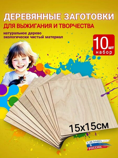 В комплекте5/10/ 15/20 штук одинаковых квадратных заготовок размером 15х15см. Изготовлены из качественной березовой фанеры толщиной 3 мм Деревянные основы тщательно отшлифованы с двух сторон, не имеет острых углов, благодаря чему изделие полностью готово к дальнейшей обработке, можно использованы на уроках труда в школе. Такие заготовки можно использовать как основы из дерева для выжигания, росписи, декупажа или как панно. Для развития ребенка, важно рукоделие и творчество, для детей наборы станут лучшим подарком. Заготовки для творчества – это хороший подарок к празднику как открытка для поздравления ручной работы! В нашем магазине можно найти подобные доски других размеров: 10х10см,15х15см,20х20см,25х25см,30х30см,35х35см,40х40см, 45х45см,50х50см.