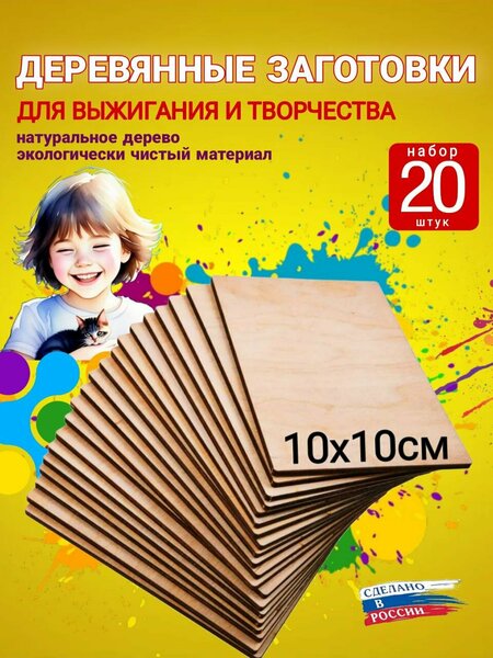 В комплекте 5/10/ 15/ 20 штук одинаковых квадратных заготовок размером 10х10см. Изготовлены из качественной березовой фанеры толщиной 3 мм. Деревянные основы тщательно отшлифованы с двух сторон, не имеет острых углов, благодаря чему изделие полностью готово к дальнейшей обработке, можно использованы на уроках труда в школе. Такие заготовки можно использовать как основы из дерева для выжигания, росписи, декупажа или как панно. Для развития ребенка, важно рукоделие и творчество, для детей наборы станут лучшим подарком. Заготовки для творчества – это хороший подарок к празднику как открытка для поздравления ручной работы! В нашем магазине можно найти подобные доски других размеров: 10х10см,15х15см,20х20см,25х25см,30х30см,35х35см,40х40см, 45х45см,50х50см.