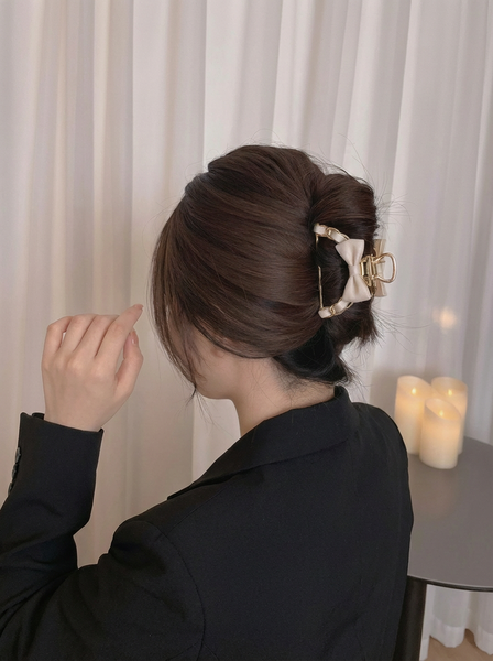 Заколка крабик для волос, метал золотой с бежевой лентой и бантиком
