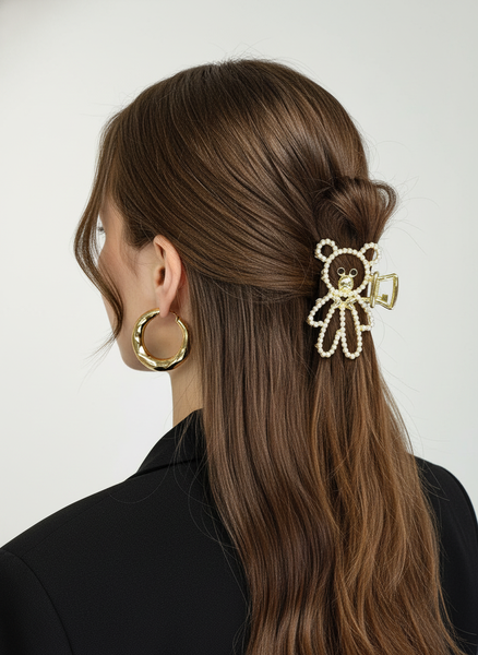 Заколка крабик для волос Медвежонок метал золотой с бусинками