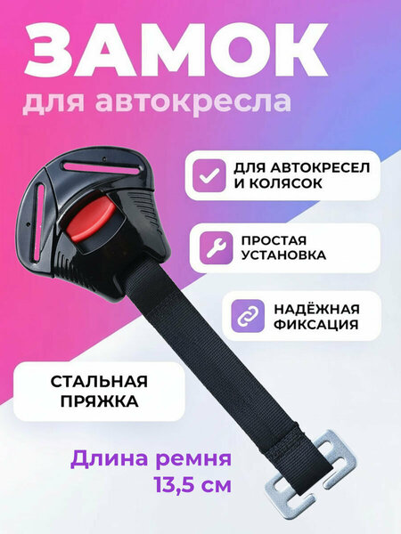 Замок для автокресла, Замок для крепленияч ремня безопасности в комплекте с лентой и пряжкой. Подходит для всех детских автокресел возрастных групп автокресел с 1 года (гр. 0-1, 0-1-2, 0-1-2-3, 1, 1-2, 1-2-3). Рассчитан под стандартный ремень в автокресле. Замок - застежка для детского автокресла служит для кепления ремней безопасности автокресла, автолюльки или детской коляски, обеспечивая безопасность во время езды. Замок подходит для ремней шириной до 38 мм, что применимо для всех возрастных категорий. Он легко устанавливается и снимается, В комплекте с замком идет ремень и застежка, которая вставляется в отверстие в сиденье вместо старой.