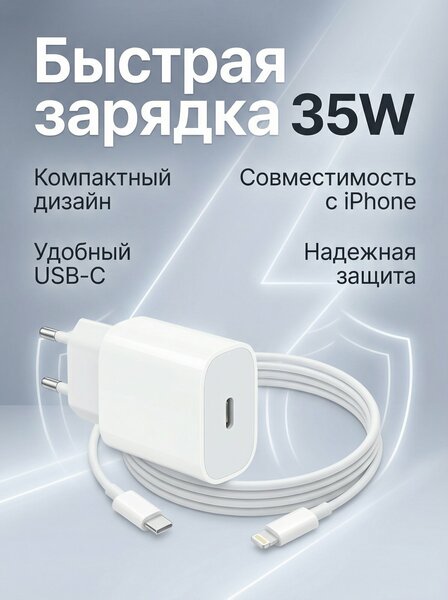 Зарядный адаптер мощностью 35 W предназначен для iPhone и других устройств Apple с разъёмом Lightning Поддержка технологии Power Delivery обеспечивает быструю стабильную и безопасную зарядку В комплект входит кабель USB Type C Lightning что позволяет использовать устройство сразу после покупки