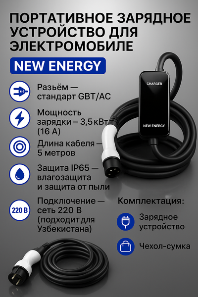 Портативное зарядное устройство для электромобилей (3.5 кВт, 16A, кабель 5 м) Надёжное и простое решение для быстрой зарядки электромобиля в любых условиях — дома, на работе или в дороге. Характеристики: • Мощность: до 3.5 кВт — эффективная зарядка за несколько часов • Сила тока: 16A — стабильная и безопасная работа • Длина кабеля: 5 метров — удобно при любой парковке • Подключение: евро-вилка 220V — совместима с электросетью Узбекистана • Универсальность: подходит для большинства моделей электромобилей • Степень защиты IP55 — корпус устойчив к пыли и влаге • Рабочий диапазон температур: от -30°C до +60°C — надёжность в любую погоду • LED-дисплей — отображение текущих параметров зарядки • Таймер — позволяет настроить удобное время начала зарядки Комплектация: • Зарядное устройство • Прочная сумка для хранения и транспортировки Преимущества: • Безопасность — защита от перегрева, перегрузки и короткого замыкания • Универсальность — подходит для большинства китайских электромобилей: BYD, Geely, Dongfeng, Chery и др. • Компактность — лёгкое и удобное в использовании • Отличное решение для ежедневного использования без необходимости в установке стационарной станции