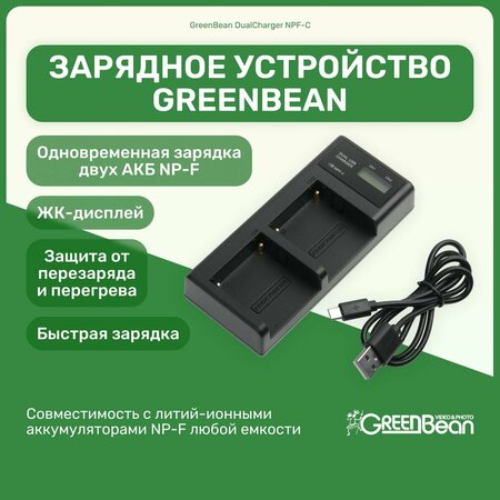 GreenBean DualCharger NPF-C – сверхкомпактное и легкое зарядное устройство для зарядки от источников питания с интерфейсом USB одного или одновременно двух литий-ионных аккумуляторов типа Sony NP-F любой емкости. Кабель micro-USB длиной 70 см входит комплект. Имеется также вход для подключения питания USB Type-C, что позволяет использовать широкий диапазон различных сетевых адаптеров и кабелей питания, например, от мобильного телефона. Яркий ЖК-дисплей отображает статус и уровень заряда каждой батареи по отдельности. Когда осуществляется зарядка аккумулятора, значок батареи мигает, а когда аккумулятор заряжен полностью – значок показывают полную мощность не мигая. Особенности