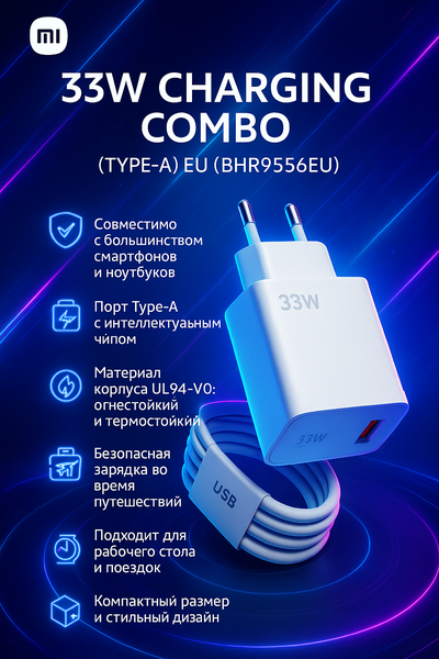 Сетевое зарядное устройство Xiaomi 33W Charging Combo (Type-A) EU (BHR9956EU) совместимо с популярными основными устройствами, для действительно легких путешествий. Встроенный интеллектуальный идентификационный чип и порт Type-C, совместимый с большинством коммерчески доступных смартфонов, ноутбуков и других электронных устройств. Более чистый рабочий стол и более легкие путешествия. Одного зарядного устройства достаточно для действительно легких путешествий. Безопасная зарядка для большинства ноутбуков с портом Type-C на рынке. Материал, устойчивый к высоким температурам. Двойная безопасность. Корпус изготовлен из огнестойкого и термостойкого материала класса UL94-V0, обеспечивающего охлаждение и безопасную и надежную работу.