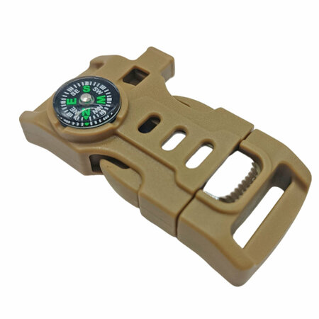 Застежка фастекс для браслета из паракорда (Песок) Застежка изготовлена из прочного ABS-пластика и как дополнительные аксессуары содержит компас, огниво, нож-скребок и свисток. Нож-стропорез будет полезен, даже если у вас есть с собой различные ножи. Он всегда под рукой и поможет сделать небольшую, но иногда очень важную работу – обрезать стропы или леску, заготовить щепу для розжига костра, не доставая из рюкзака большой нож.