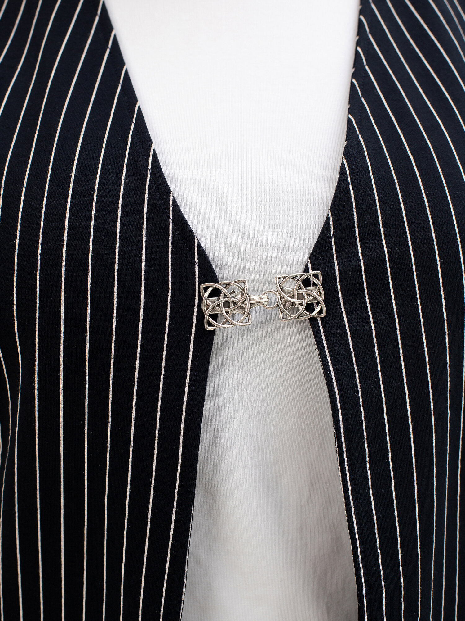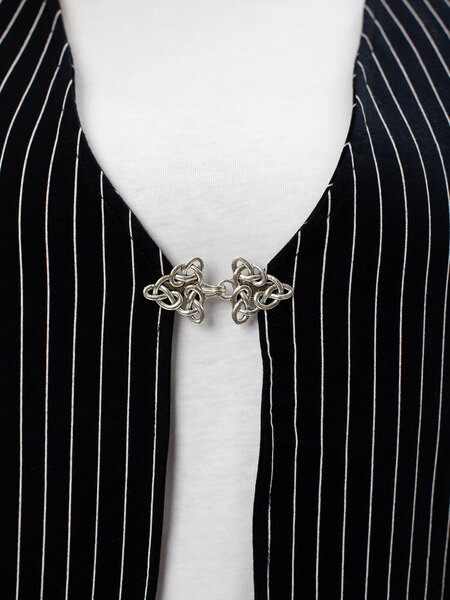 Достоинства:Зажим на клипсах, не оставляет следов на одежде, легко надевается. Недостатки:Зажим на клипсах, поэтому может соскочить, если резко потянуть полы одежды. Комментарий:Полностью соответствует описанию и фотографиям.