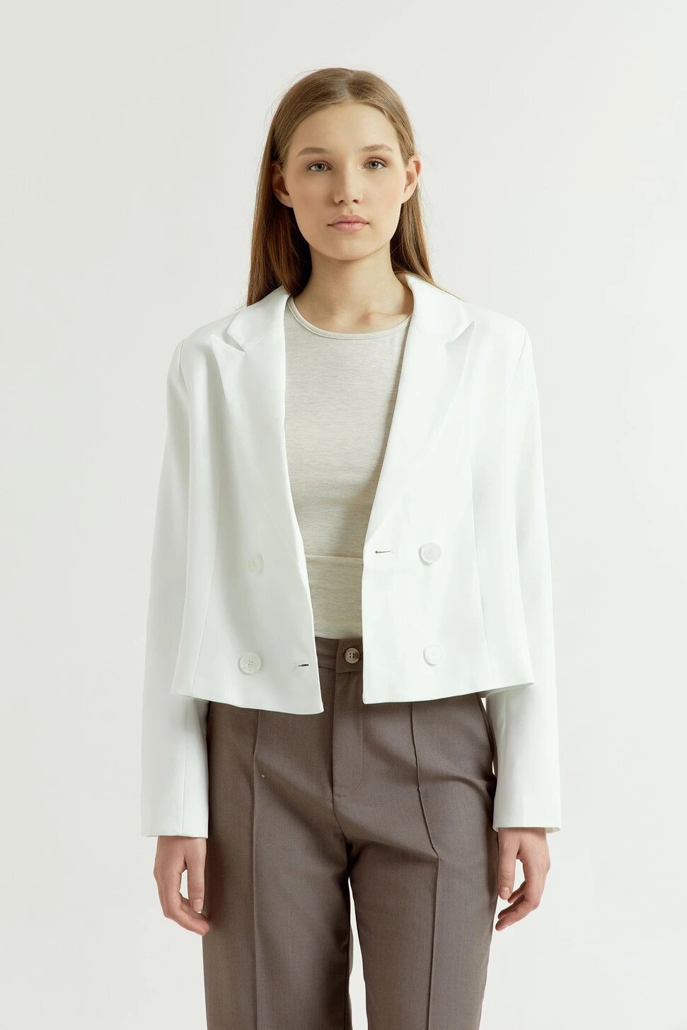 Укороченный жакет двубортного кроя с подчеркнутой линией плеч и застежкой на пуговицы. Сочетайте модель с брюками и юбками в офисных и повседневных образах.