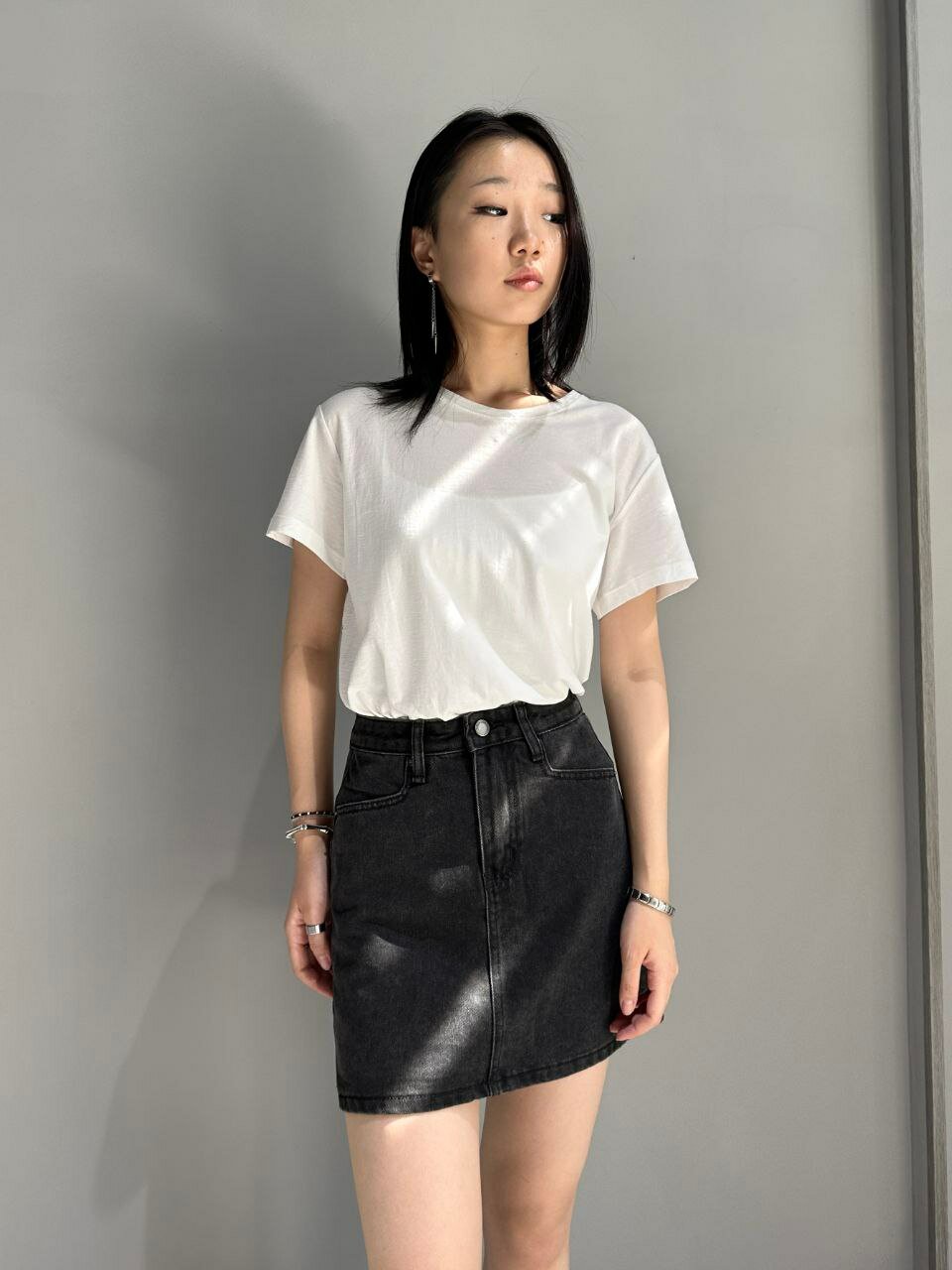 Фасон и крой: Тип: Джинсовая мини-юбка (прямая, слегка трапециевидная). Длина: Примерно до середины бедра. Посадка: Средняя или высокая посадка. Крой: Прямой, с небольшим расширением к низу для комфорта при ходьбе. Низ: Слегка закругленные разрезы по бокам для свободы движения. Материал: Ткань: Плотный деним (джинсовая ткань). Состав: Хлопок с возможным добавлением эластана для легкой растяжимости. Особенности дизайна: Застёжка: Классическая — пуговица и молния спереди. Карманы: Два накладных кармана спереди. Наличие задних карманов не видно, но скорее всего они есть — как в классических джинсах. Пояс: С петлями для ремня. Швы: Контрастные, двойные, характерные для джинсовой одежды. Цвет и эффект стирки: Цвет: Классический темно-синий деним. Обработка: Эффект выбеливания (вареный деним) на передней части, придающий изделию винтажный и повседневный вид. Цвет: Угольно-черный или графитовый деним. Обработка: Очень легкий эффект стирки, почти однотонная — выглядит более минималистично и универсально. Стиль и применение: Подходит для повседневной носки. Хорошо сочетается с футболками, топами, рубашками, свитерами и кедами или ботильонами. Можно использовать как элемент базового гардероба.