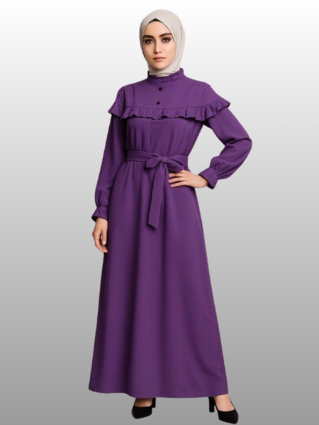 Платья из лён и среднеплотного материала. Фасон: трапеция с кокетками и оборками вокруг декольте. Имеется пояс для дополнительной коррекции. Рукав длинный на манжетах, которая обработана тоже оборочками. Воротник стойка, тоже обработана оборками. передняя часть фиксирована на пуговицах что даёт дополнительную удобства.