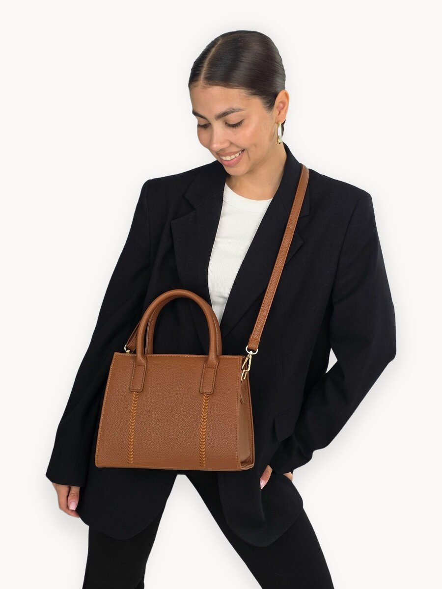 Каркасная женская сумка из искусственной кожи с декоративной строчкой. Два отделения, карман-перегородка на молнии. Съёмный ремень и ручки. Подходит для города, офиса и повседневного использования. Размер средний, вмещает формат A5.