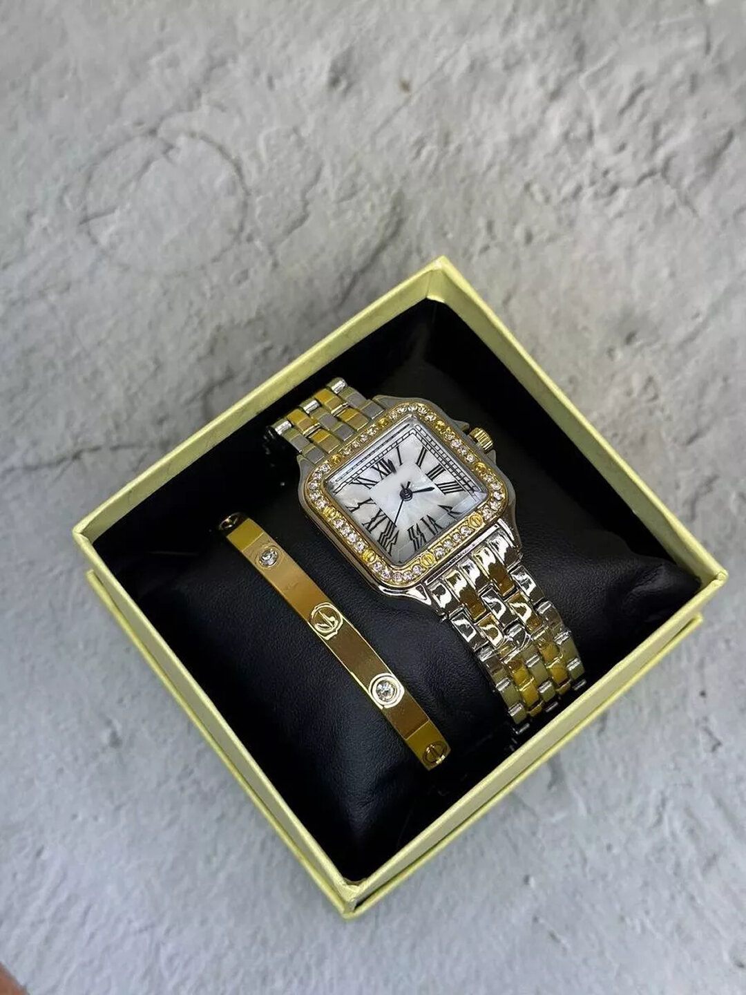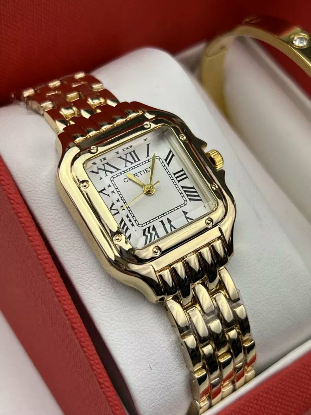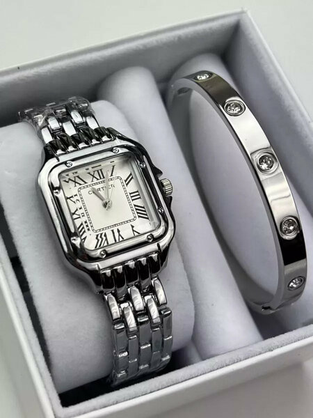 Этот элегантный и роскошный подарочный набор от — идеальный выбор для современной женщины. В комплект входят классические часы с кварцевым механизмом и стильный браслет, гармонирующий с часами. ✅ Характеристики часов: Бренд: Кварцевый механизм Белый циферблат с римскими цифрами Удобный и стильный металлический браслет ✅ Характеристики браслета: Оригинальный дизайн Cartier Элегантный и минималистичный стиль Подходит к любому образу Почему этот набор — идеальный подарок? Роскошный дизайн и элегантный внешний вид Подходит для дня рождения, 8 Марта или любого особенного события ✨ Классика и современность в одном стиле Порадуйте себя или своих близких!