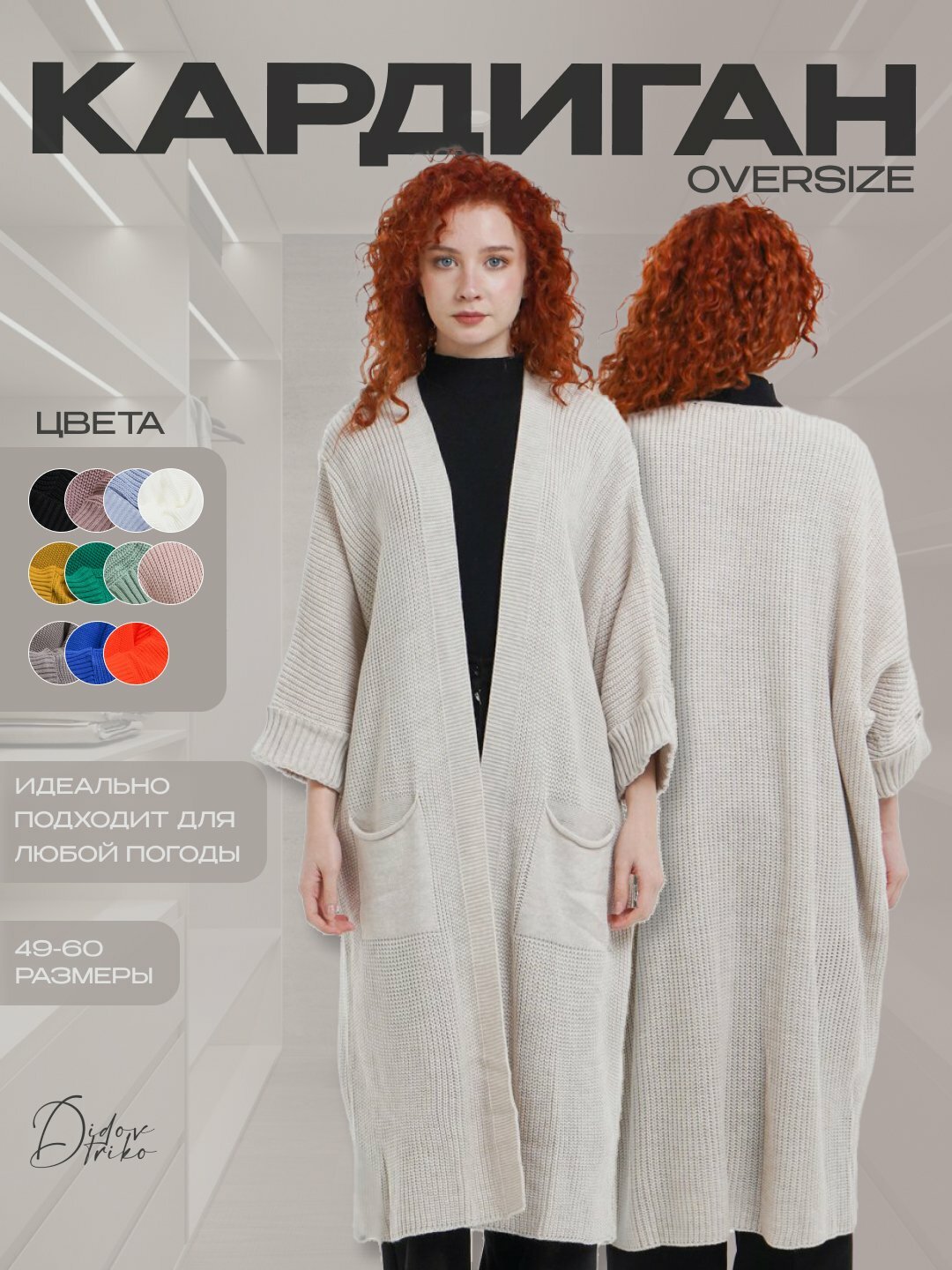 Oversize – (от 46 до 60) размер Длина кардигана - 120-125 см Ширина кардигана - 54 см Идеально подходит для любой погоды. Кардиган с V-образным вырезом Вязаный длинный кардиган. Мягкий, стильный вязаный кардиган с карманами Длинный кардиган Didov Triko – это идеальное сочетание стиля и комфорта. Этот кардиган, выполненный из мягкого и плотного материала, согреет вас и создаст уют в холодные месяцы. Его насыщенный, яркий цвет придает вашему образу свежесть и привлекательную привлекательность, делая кардиган незаменимым предметом гардероба. Кардиган подойдет для повседневной носки, прогулок или работы благодаря свободным и удобным карманам. Его сочетают с брюками, юбками и джинсами, создавая стильные и практичные образы. Этот кардиган станет незаменимым дополнением вашего гардероба в холодные дни.