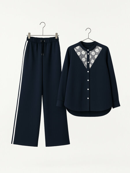 Женский комплект (двойка) — стильный и удобный вариант для повседневной носки. Комплект состоит из свободной рубашки и широких брюк. Верх (рубашка): Рубашка прямого, свободного кроя с длинным рукавом. Модель украшена декоративной вставкой с узором в области груди, что придаёт образу изысканность. Застёжка на пуговицах спереди, круглый воротник. Подходит для комфортной носки в течение всего дня. Низ (брюки): Брюки свободного кроя с эластичным поясом на резинке и завязках. По бокам выполнены контрастные лампасы, визуально удлиняющие силуэт. Модель не сковывает движения и отлично подходит для активного образа жизни.