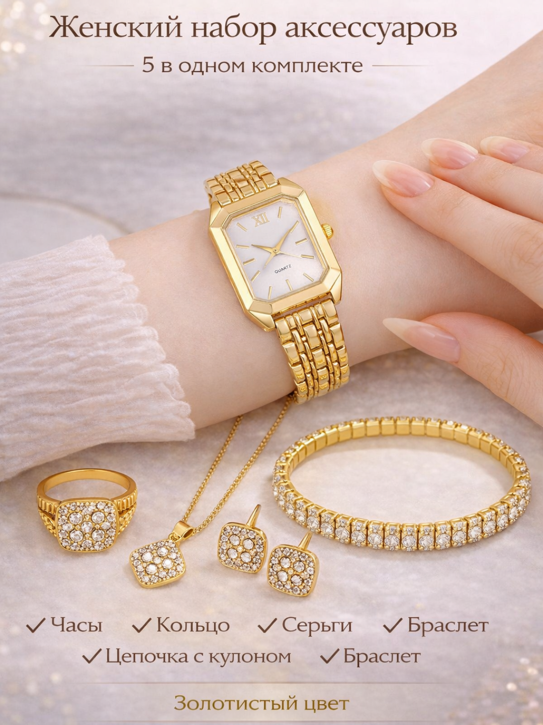 Набор аксессуаров для женщин включает в себя пять предметов, которые помогут создать неповторимый образ и подчеркнуть вашу индивидуальность. В комплект входят наручные часы, которые станут незаменимым аксессуаром в повседневной жизни. Они не только помогут следить за временем, но и дополнят ваш стиль. В наборе также представлены серьги, которые добавят блеска и изящества вашему образу. Они выполнены в различных стилях и формах, что позволяет выбрать наиболее подходящий вариант для любого случая. В комплекте вы найдете браслет, который станет ярким акцентом вашего образа. Он выполнен из качественных материалов и будет радовать вас своим внешним видом и удобством носки. В наборе представлены также ожерелье и кольцо, которые дополнят ваш образ и подчеркнут вашу индивидуальность. Все аксессуары из набора выполнены в едином стиле, что позволяет создать гармоничный и завершенный образ. Выбирая этот набор аксессуаров, вы получаете пять предметов, которые помогут вам создать неповторимый образ и подчеркнуть вашу индивидуальность.