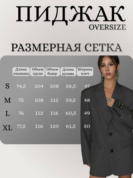 Внимание! Размерная таблица имеется Удлинённый, свободный крой На подкладе Наличие функциональных карманов и качественная фурнитура Материал устойчив к износу и не требует сложного ухода Идеальное решение для тех, кто хочет добавить в свой стиль современные нотки Стиль оверсайз остается актуальным уже несколько сезонов подряд и не теряет своей популярности Свободный фасон обеспечивает комфортную носку независимо от комплекции Отличный вариант для подарка сестре, подруге или коллеге Однотонный, однобортный дорогие наши покупатели! Обратите внимание! Размерная сетка продавца вложена В галерею фото! Женский пиджак - это не просто элемент гардероба, это настоящий стильный акцент! Модель оверсайз с безупречным кроем и удлиненным силуэтом - идеальный выбор для любой девушки.
