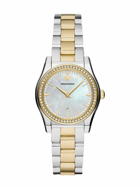 Federica. Женские часы в круглом стальном корпусе. Перламутровый циферблат с метками в виде штрихов. Окошко даты находится в положении 6 часов. Безель украшен кристаллами. Стальной браслет с раскладывающейся застежкой. Бренд Emporio Armani Страна Италия Пол Женский Стиль Классические, Повседневные Стекло минеральное повышенной прочности Браслет стальной Механизм кварцевый Габариты 34 мм Водозащита 5 атм Цвет циферблата стальной Цвет корпуса стальной Цвет браслета биколор сталь золото Форма циферблата круг Тип маркировки на циферблате метки Толщина корпуса 9 мм Вес часов 72 Ширина ремешка 12 мм Тип замка бабочка