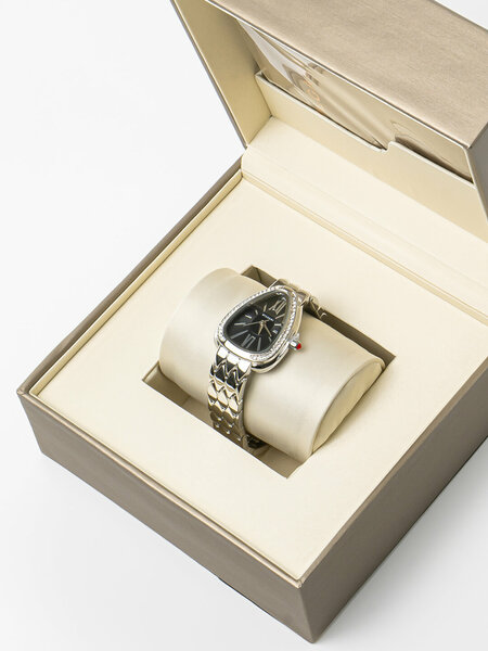 Женские часы BVLGARI Serpenti Style созданы для тех, кто выбирает элегантность и уверенность. Корпус в форме капли со вставками из кристаллов создаёт роскошный акцент, а блестящий браслет со змеиным рисунком подчеркивает уникальность дизайна. Подойдут как для делового образа, так и для вечерних выходов. Доступны в вариантах: серебро, золото-серебро, чёрный и белый циферблат. • Механизм: кварцевый • Корпус: металлический, с кристаллами • Браслет: стальной, регулируемый • Диаметр корпуса: 32×38 мм • Толщина: 9 мм • Цвета: серебристый / чёрный / золото-серебро • Циферблат: с римскими цифрами • Стекло: минеральное • Застёжка: скрытая • Водозащита: 3 ATM