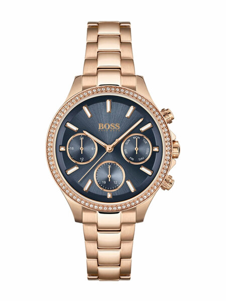 Блеск кристаллов на золотистом корпусе станет ярким акцентом в вашем образе и легко поднимет настроение. Женские наручные кварцевые часы Hera. Круглый корпус украшен кристаллами. Циферблат выполнен по технологии Sunray (солнечные лучи). 12-ти и 24-х часовой формат времени, число и день недели отображаются на отдельных циферблатах. Метки в виде штрихов. Рифленая заводная головка с защитой. Браслет с раскладывающейся застежкой. Бренд Hugo Boss Страна Германия Пол Женский Стиль Классические, Повседневные Стекло минеральное повышенной прочности Браслет стальной Механизм кварцевый хронограф Габариты 38мм Цвет циферблата синий Цвет корпуса золото Цвет ремешка золото Форма циферблата круг Тип маркировки на циферблате метки Толщина корпуса 9 мм Вес часов 78 Ширина ремешка 11 мм Тип замка клипса