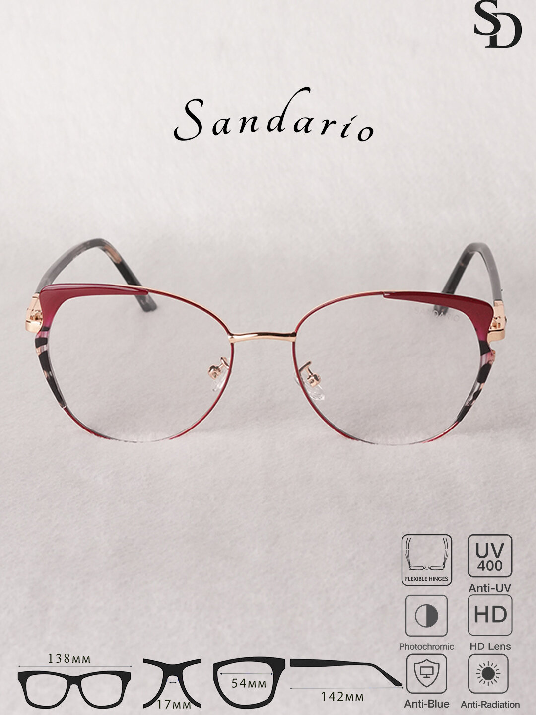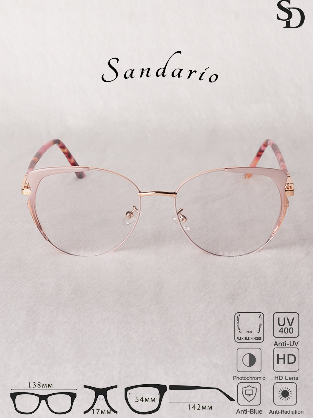 Женские очки SANDARIO в форме «кошачий глаз» — это элегантный аксессуар с лёгкой металлической оправой, сочетающий стиль и комфорт. Модель оснащена HD-линзами, защитой Anti-Blue, Anti-Radiation и UV400, фотохромом и гибкими шарнирами для удобной и надёжной посадки.