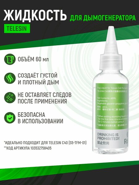 Жидкость для тумана для портативной дым-машины Telesin C40 Создайте незабываемую атмосферу для своих видео и мероприятий с помощью жидкости для тумана Telesin C40. Этот высококачественный продукт, разработанный с учетом потребностей профессионалов в области светового и сценического оборудования, идеально подходит для создания эффектов дыма, которые добавят волшебства любому мероприятию. Состав и безопасность: Жидкость состоит из растительного глицерина и пропиленгликоля пищевого класса, что гарантирует безопасное использование и минимальное воздействие на окружающую среду. Продукт прозрачного цвета отлично растворяется в воздухе и обеспечивает стабильное и продолжительное выделение тумана. Указания по использованию: При первом использовании жидкости рекомендуется дать ей постоять в резервуаре дым-машины в течение 2 минут для достижения оптимальных результатов. Это обеспечит лучший эффект и долговечность работы вашего оборудования. Преимущества: Высокое качество и надежность. Экологически чистый состав. Идеально подходит как для профессионалов, так и для любителей видеосъемки. Создает уникальные визуальные эффекты для любых мероприятий. В нашем магазине дымогенератор Telesin C40 можно найти по артикулу 5502939453. Жидкость для генератора дыма Telesin C40 - ваш надежный помощник в мире видеосъемки и эффектного сценического оформлении!