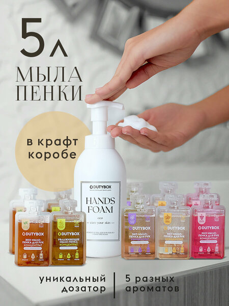 Идеальный эко подарок с лимитированным универсальным дизайном, понравится любителю минимализма! Набор содержит многоразовую пластиковую бутылку-дозатор и 10 капсул-концентратов, упакован в стильную крафтовую подарочную упаковку. Станет классным подарком ценителю минимализма. Вы получите пять разных уникальных ароматов в комплекте ( Камелия и масло арганы, Алое вера и зеленый чай, Олива, Ваниль и нероли, сочные ягоды в йогурте ). Стильный диспенсер дополнит интерьер кухни и ванной комнаты. Увлажняющее мыло пена подходит для использования с первых дней новорожденных 0+. Смягчающие компоненты антибактериального мыла сохраняют защитные функции кожи, обеспечивают деликатный уход, эффективно удаляет запах, не вызывая сухости и раздражения. Подходит для малышей, детей и для чувствительной кожи рук, ног, шеи, тела, для лица. Бережный нейтральный Ph состав 5,5 с натуральными маслами подходит для использования в качестве геля для душа. Бережный состав мыла для рук от Дьюти бокс с натуральными маслами подходит для использования в качестве геля для душа. Используйте в дополнение к вашим ежедневным уходовым средствам, крем, скраб и пилинг. Безопасно для септика. Используйте в дополнение к вашим ежедневным уходовым средствам, крем, скраб и пилинг. Безопасно для септика. Готовое гигиеническое средство предназначено только для пенного дозатора, он обеспечивает экономичный расход средства. Способ применения: отрежьте ножницами горлышко одной капсулы 50мл, смешайте её содержимое с 450 мл воды, накрутите дозатор и перемешайте. Готовое гигиеническое средство предназначено только для пенного дозатора, он обеспечивает экономичный расход средства и образует мягкую плотную мыльную пену. Набор заменит огромную канистру средства, его удобно хранить и не требует дополнительной подарочной упаковки.