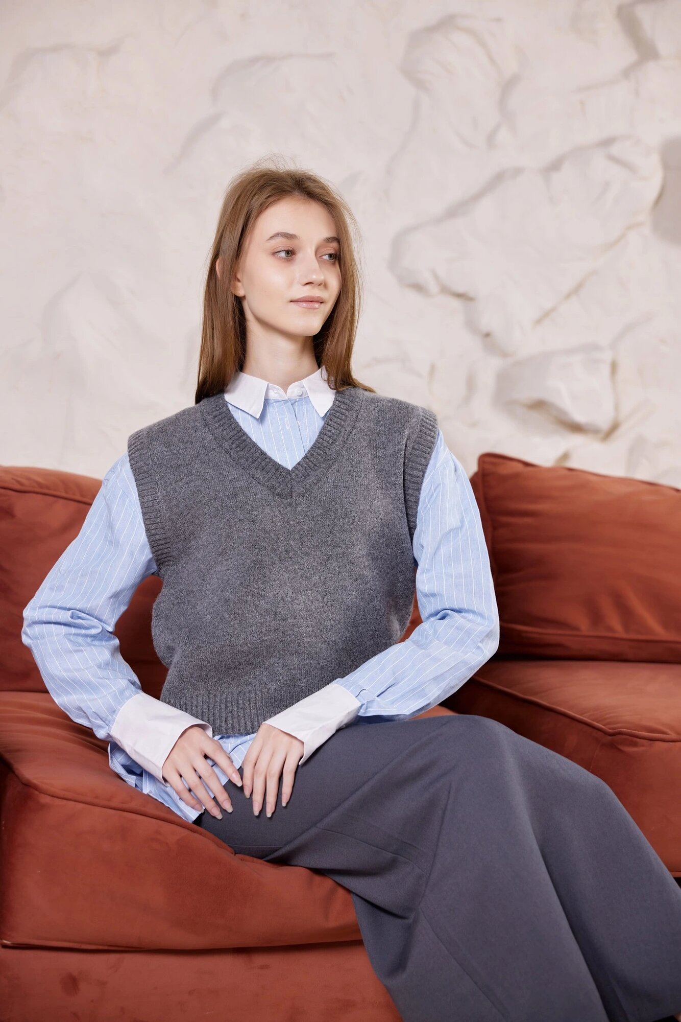 Жилет прямого свободного кроя с V-образным вырезом и приспущенными плечами. С недавнего времени жилеты триумфально вернулись в моду и являются одним из главных трендов. Если раньше они были больше предметом классического гардероба, то в последние годы уверенно вошли в кэжуал, спортивный и другие стили. Потому не бойтесь экспериментировать и сочетайте жилет в самых разнообразных образах.